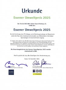 Mit unseren Projekten, Solaranlage auf unserem Vereinsheim und recyceltem Unterstand, haben wir den Essener Umweltpreis 2025,